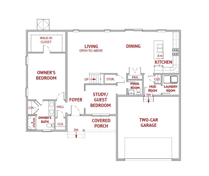 The Caledonia is a thoughtfully designed home that offers the convenience of first-floor living with the added space and privacy of a full second floor. The exterior features a covered entry porch with soaring twin gables and optional stone wainscoting, providing a welcoming and timeless look. Inside, the open-concept layout includes a spacious kitchen, dining, and living areas that flow seamlessly together, perfect for everyday living and entertaining. A study near the foyer offers versatility, ideal for a home office or guest bedroom. The first-floor Owner's Suite is generously appointed for comfort and privacy, while the second floor features large bedrooms with ample closet space, all connected by a cozy loft area. The home is designed for efficiency with an adjacent mudroom and separate laundry room. With its functional layout, ample storage, and beautiful design, the Caledonia offers both practicality and style for modern living.